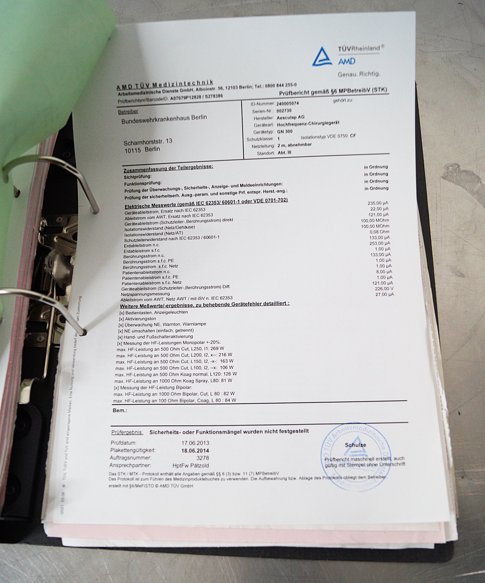 Der Käufer wird darauf hingewiesen, dass er bei der Inbetriebnahme die MPG sowie die Betriebsverordnung für medizinische Geräte einzuhalten hat und soweit vorgeschrieben eine entsprechende Sicherheitstechnische Kontrolle des Gerätes durchführen lassen muss. Für diese Einhaltung ist der Käufer selbst verantwortlich, evtl. anfallende Durchsichten oder Prüfungen sind nicht Bestandteil des Angebotes.