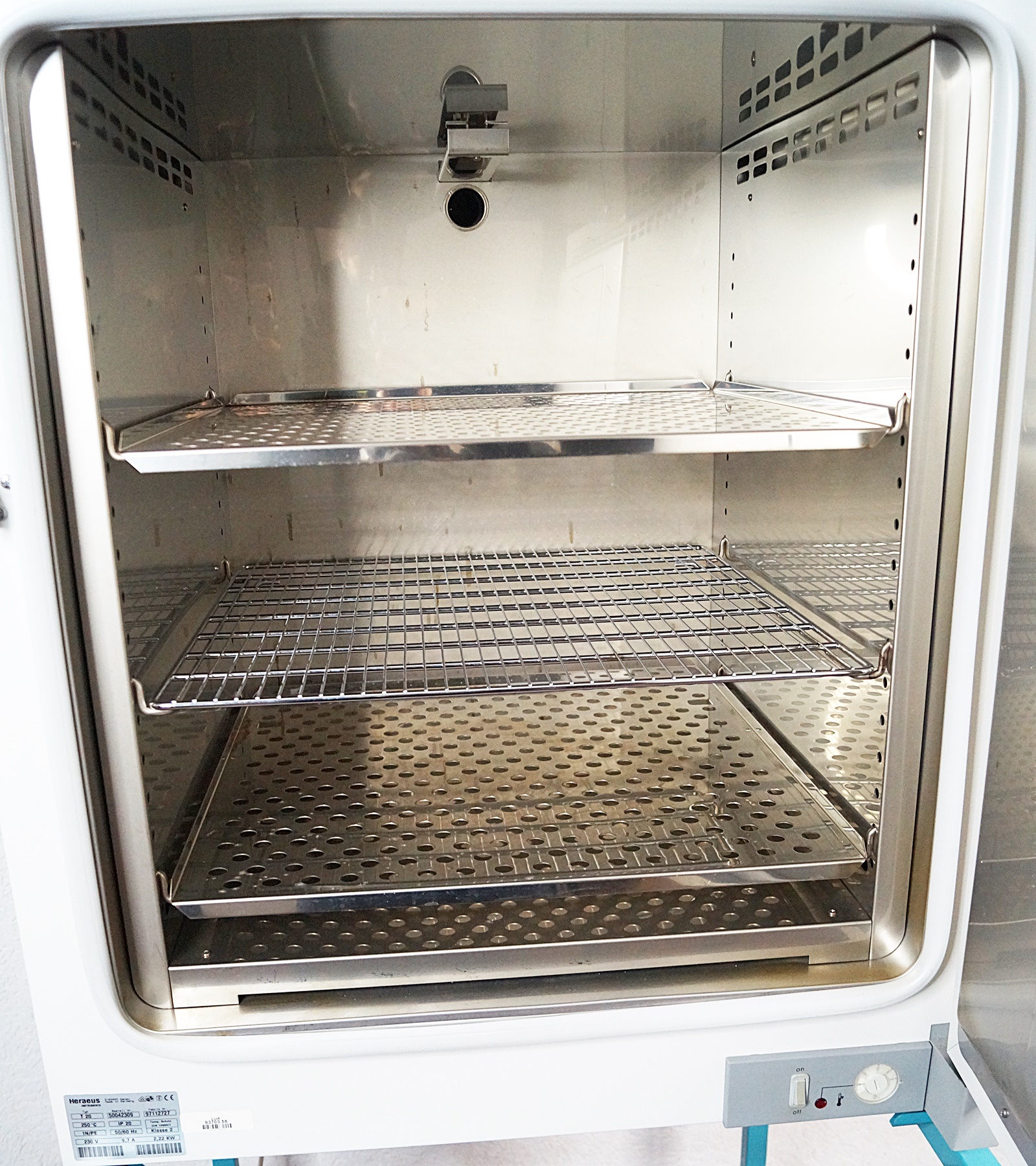 Zubehör: 230V 2,22KW, Prüfbuch, Unterbau; 3 Ablagen Innen die in der Höhe Verstellbar sind, 250C°, RS 232 Anschluss